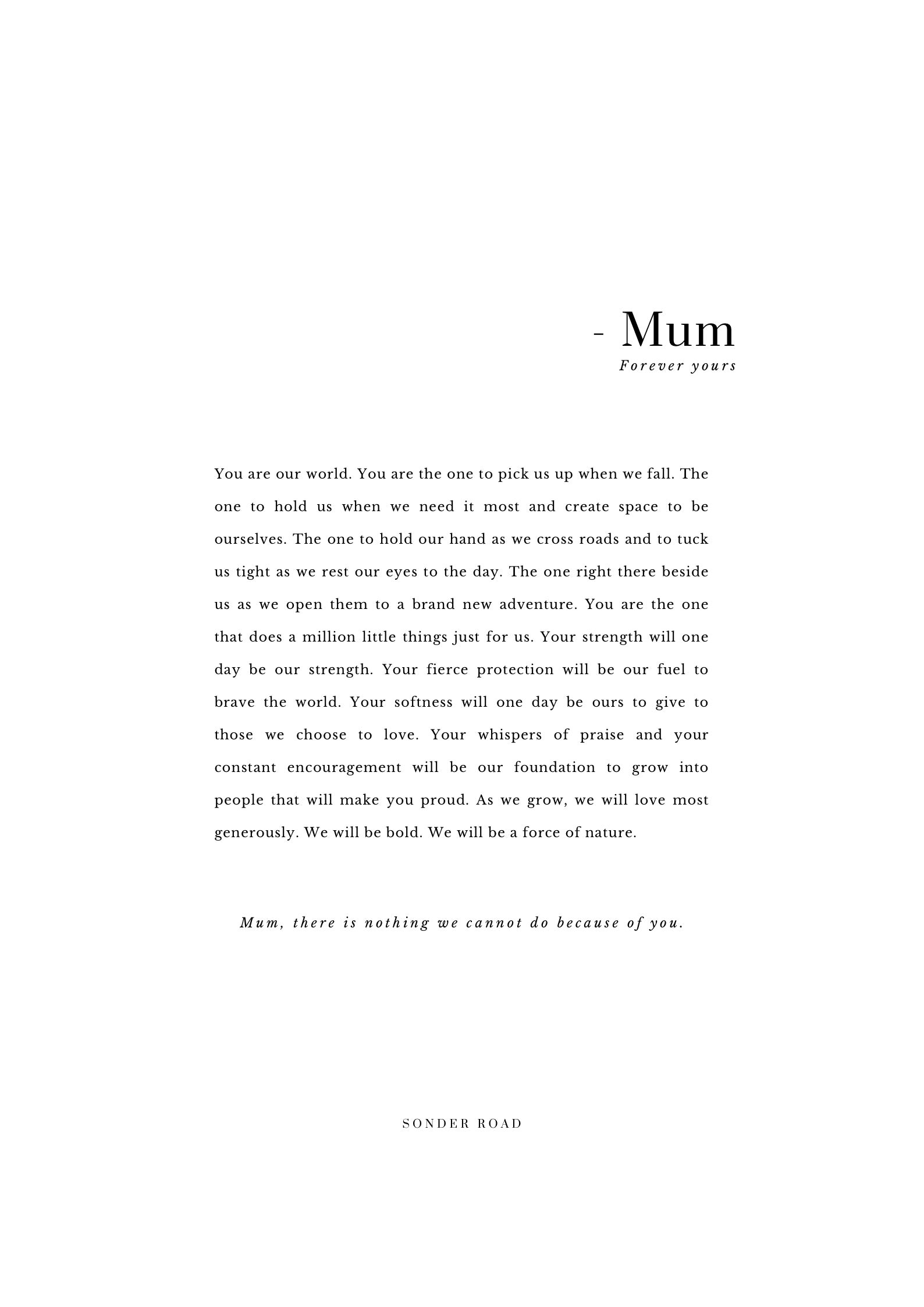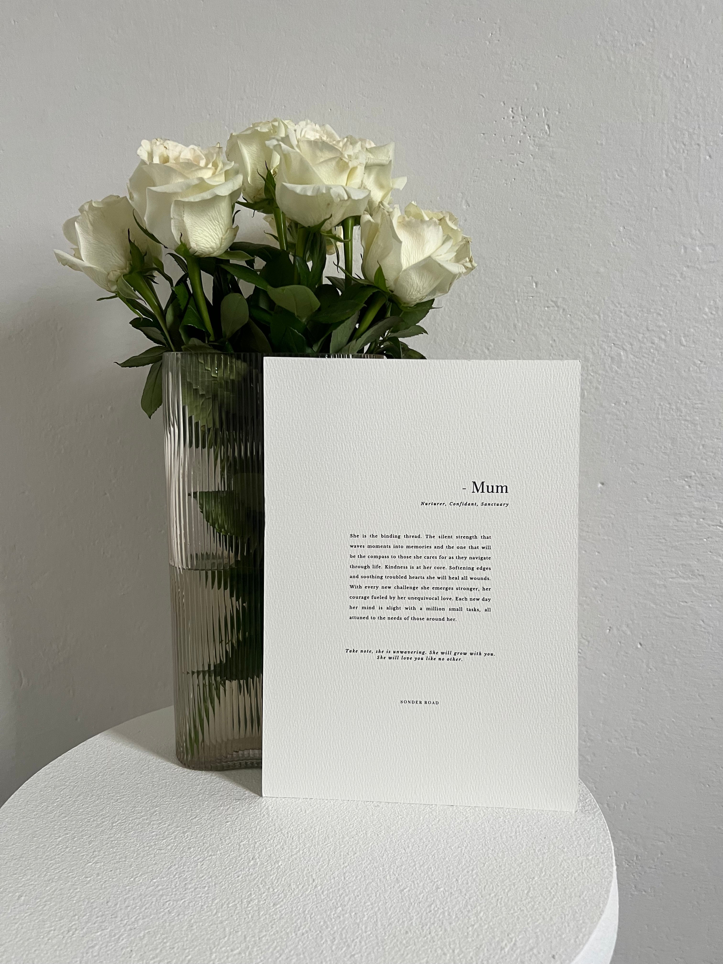 A love letter to the woman who holds everything together. The Mum print by Sonder Road captures the quiet, unshakeable strength of motherhood — the binding thread, the steady compass, the heart that heals.